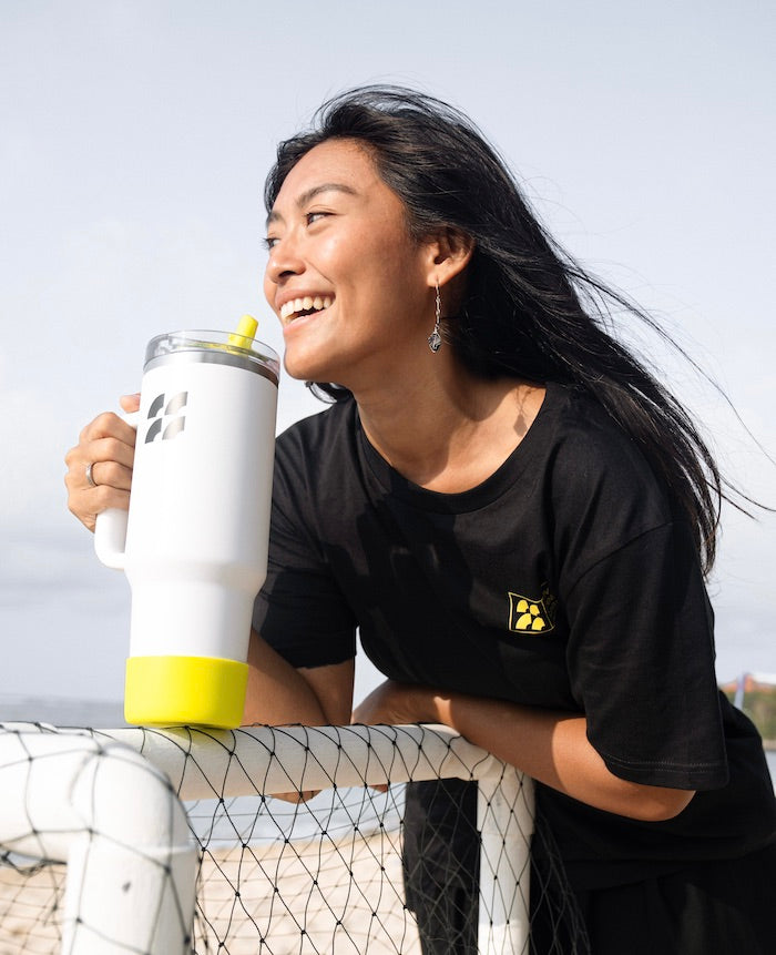 Meet the Clutch Bottle. It’s an insulated stainless steel tumbler with handle that keeps you hydrated in a simple, stylish way. Its clean white finish and Seven Clean Seas accents make it look good anywhere. Plus, the sturdy handle gives you an easy grip whether you’re at the office, the gym, or the beach.